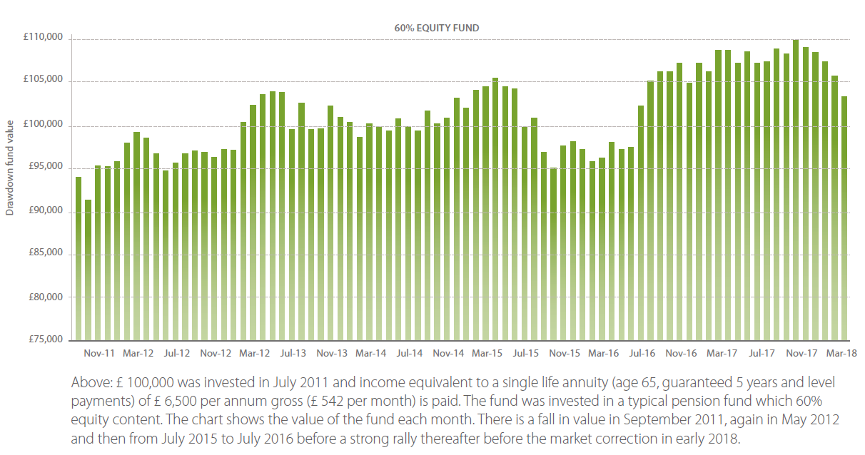 The chart below shows the sequence of returns in practice. Notice how the fund (green bars) falls in value soon after the start of the drawdown because the stock market has fallen. In this case the situation is saved because there was strong growth in the stock market during 2012 but if the market had not bounced back so quickly this drawdown pot would have been in a sorry state.