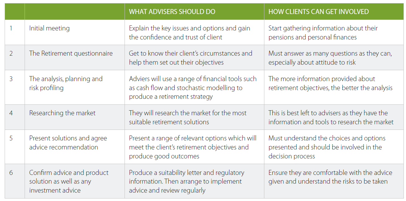 Retirement advice is more complicated and often involves additional steps because there are more factors and solutions to take into account. These extra steps include educating clients about their options and the key issues, encouraging them to think about their longer-term objectives and equipping them with the tools to compare and contrast the options presented to them.